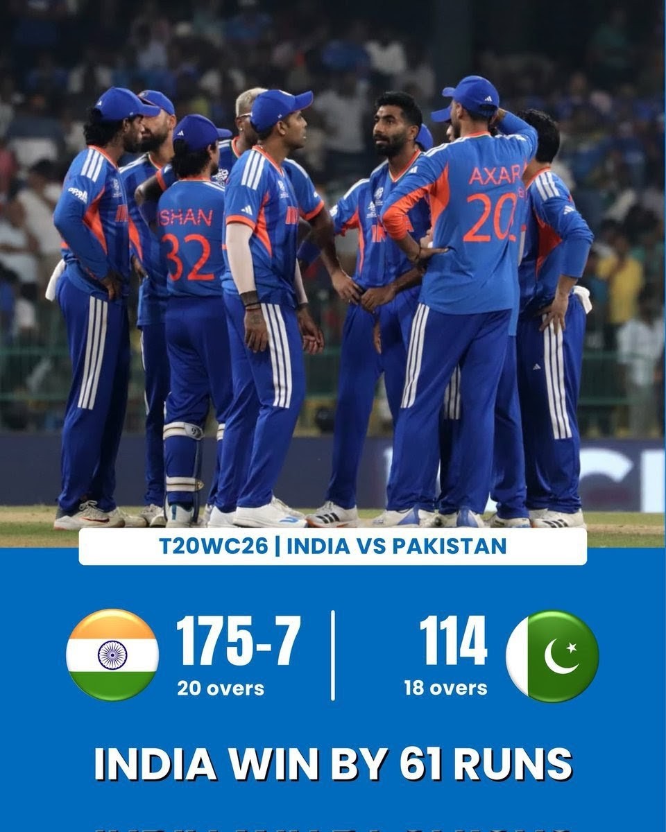 The 61-run victory marked one of India’s most emphatic wins over Pakistan in T20 World Cup history, reaffirming their strong record in global tournaments.