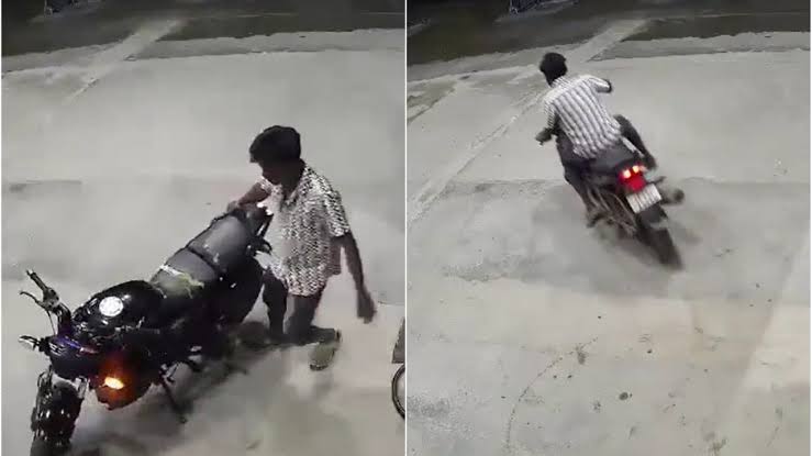 The CCTV clip timestamped around 2:20–2:23 AM on October 24 shows two men on a motorcycle pulling up at a petrol pump. The pillion passenger dismounts briefly, apparently searching for assistance, while the rider waits beside the pump.