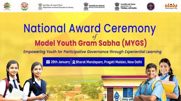 The Ministry of Panchayati Raj, in collaboration with the Ministry of Education and the Ministry of Tribal Affairs, will host the National Award Ceremony for the Model Youth Gram Sabha (MYGS) winners on 28th January 2026 in New Delhi. Union Minister of State for Panchayati Raj, Prof. S.P. Singh Baghel, and Union Minister of State for Education, Dr. Sukanta Majumdar, will grace the event.