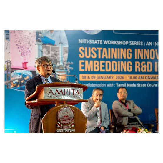 NITI Aayog conducted the National Workshop on “Sustaining Innovation: Embedding R&D in State Institutions” on 8th–9th January 2026 at Amrita Vishwa Vidyapeetham, Coimbatore. Chaired by Shri Suman Bery, Vice Chairman, NITI Aayog, the workshop brought together planning secretaries, state council leaders, industry experts, and institutional heads to explore pathways for strengthening India’s state-level innovation and research ecosystems.